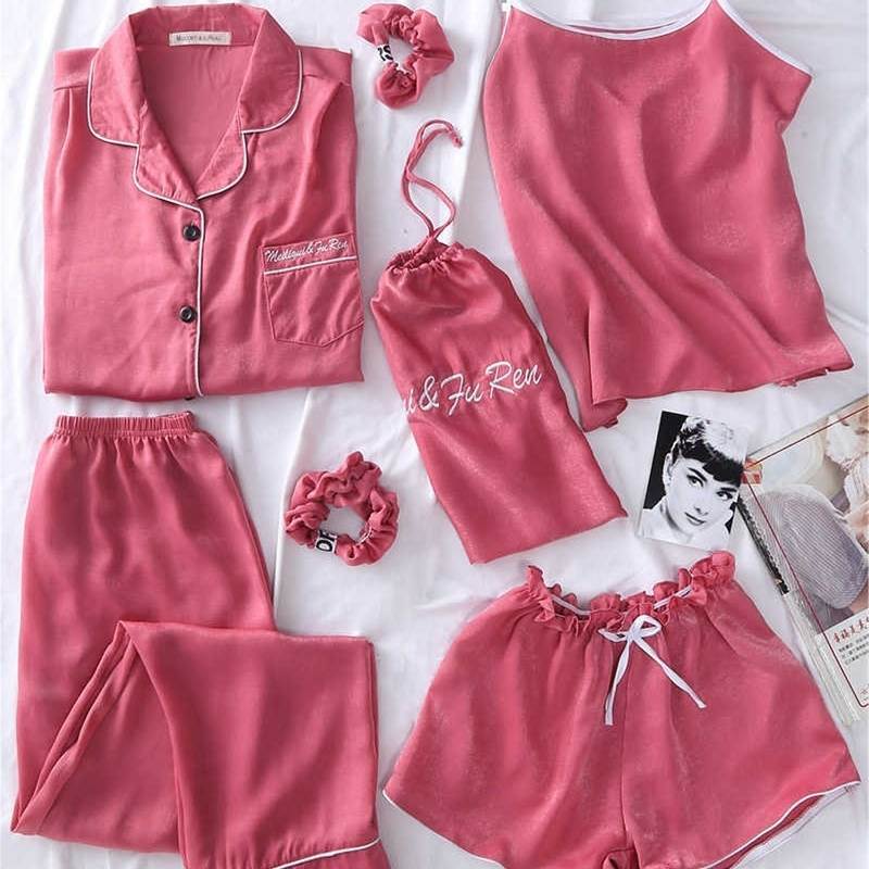 レディースナイトウェア 7点 セットアップ ルームウェア パジャマ 寝間着 キャミソール パンツ ショート丈 ロング丈 シュシュ 巾着 ポーチ 収納 カラバリ オールシーズン 春 夏 秋 冬 かわいい 大人可愛い キュート 大人女子 ラブリー ガーリー ツーピース お得 旅行 リゾート バカンス お泊まり 休日 リラックスウェア お揃い 色違い 楽ちん グレー ピンク ライトブルー ローズ サイズ展開 M L XL