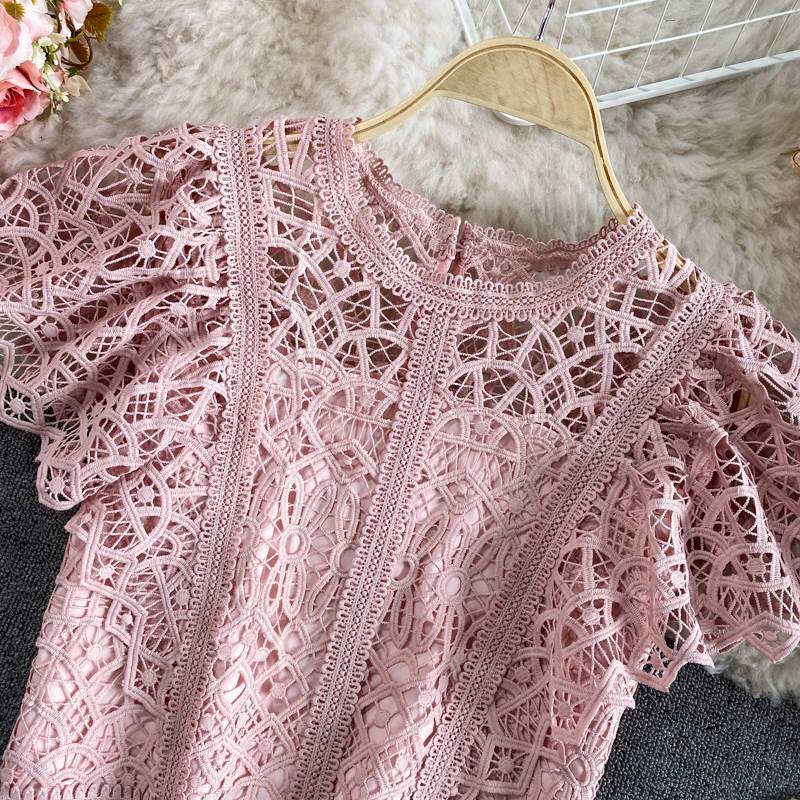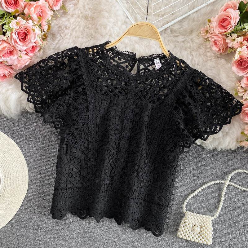 トップス ショート丈 花柄 透かし レース シャツ ブラウス 透け感 ミニ丈 クロップド 半袖 袖あり ラウンドネック 背面ジッパー ファスナー 裏地付き スリム 細身 ガーリー ラブリー キュート フェミニン 主役級 大人可愛い かわいい 可愛い 大人女子 おしゃれ お洒落 通勤 通学 学生 お出かけ デート 旅行 休日 普段着 普段使い 着回し レディース 10代 20代 夏 S M L ブラック 黒 ホワイト 白 グリーン 緑 ピンク