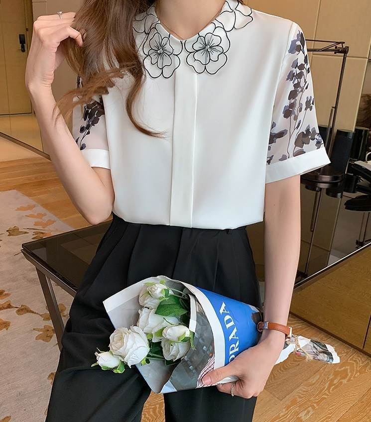 トップス 半袖 袖あり シャツ ブラウス 透かし デザイン レトロ 刺繍 プリント 花柄 襟付き シンプル 大人 大人女子 おしゃれ お洒落 大人可愛い かわいい 可愛い 女子会 通勤 通学 OL オフィス お出かけ デート 旅行 休日 普段着 普段使い 着回し 10代 20代 レディース 夏 大きいサイズ S M L XL 2XL ホワイト 白