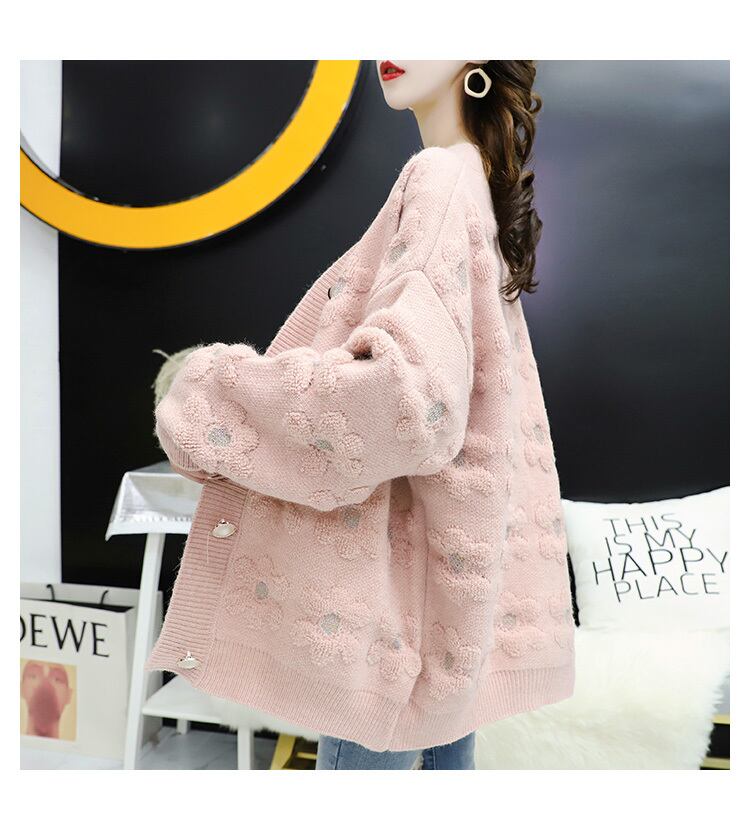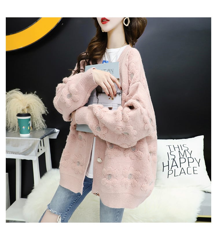 トップス カーディガン 長袖 ボリューム袖 もこもこ モコモコ ふわふわ 前開き ニット かわいい おしゃれ お洒落 ラブリー キュート ガーリー 柄 花柄 フラワー 着回し 普段使い 重ね着 お揃い 韓国 韓国系 オルチャン ファッション コーデ トレンド 流行 インスタ映え M L XL 2XL 3XL 白 ホワイト 青 ブルー ピンク