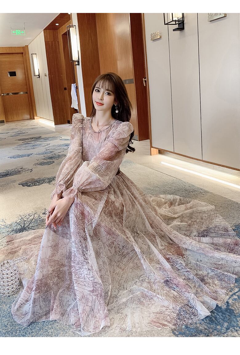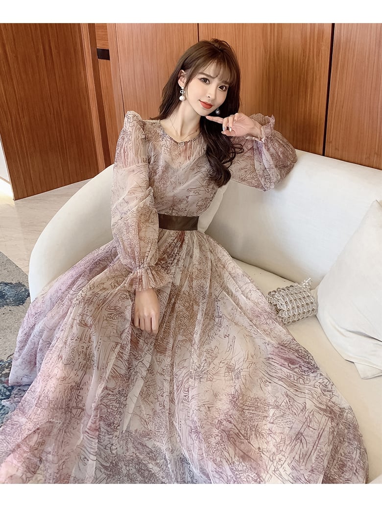 ドレス ワンピース ロングスカート フレアスカート ロング丈 袖あり 長袖 ボリューム袖 Uネック Aライン ベルト ハイウエスト かわいい 大人可愛い きれいめ 大人 上品 おしゃれ 大人女子 柄 春 秋 10代 20代 レディース デート お出かけ パーティー お呼ばれ ファッション サイズ S M L XL 色展開 ブルー ピンク