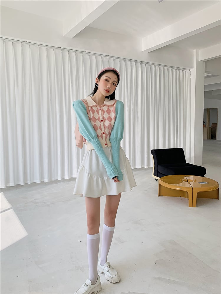ピンクのダイヤモンドチェックと水色のバイカラーのような袖がアクセント。ボタンがハートなのもポイント。キュートなガーリーコーデにおすすめなカーディガンです。