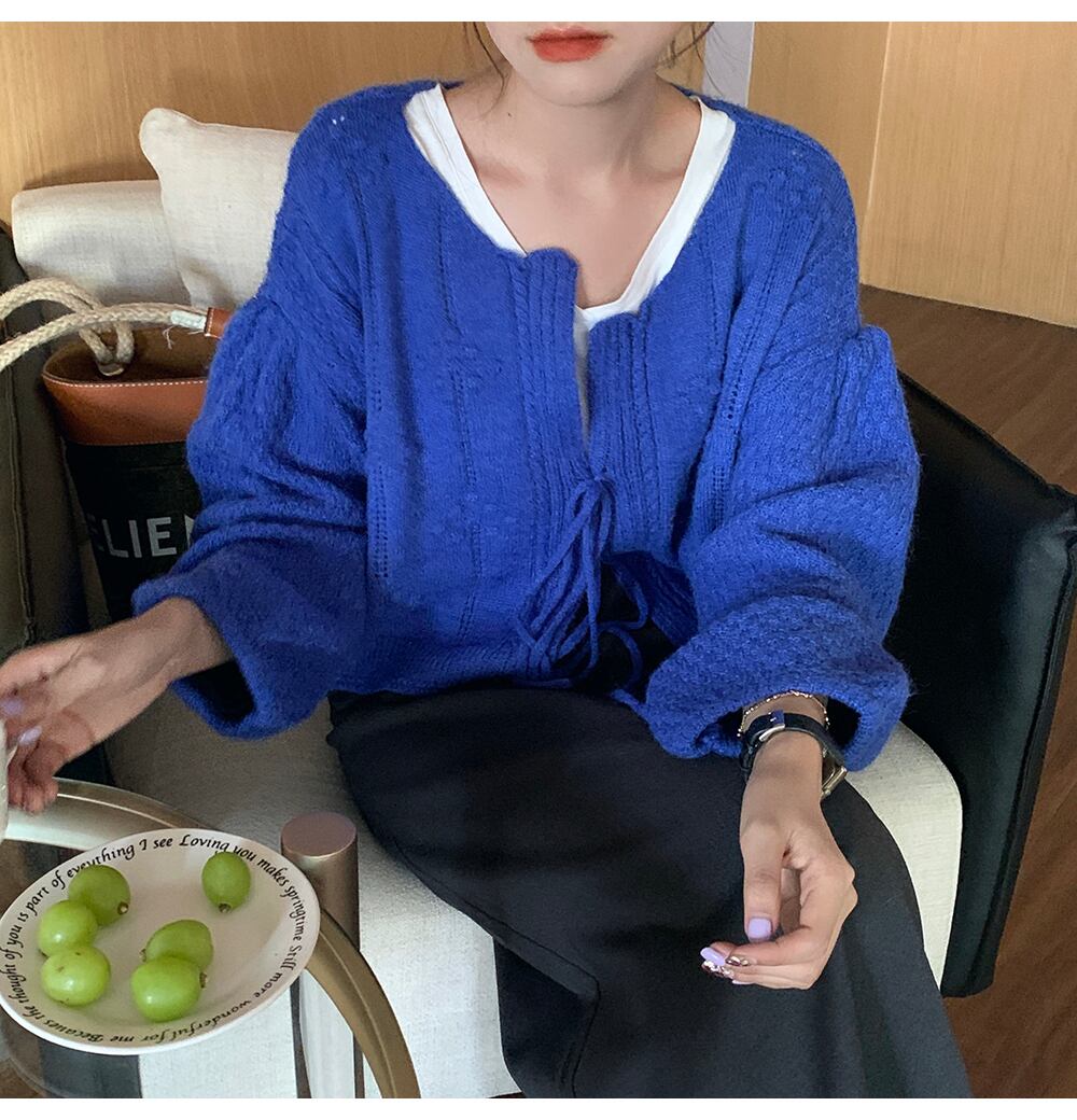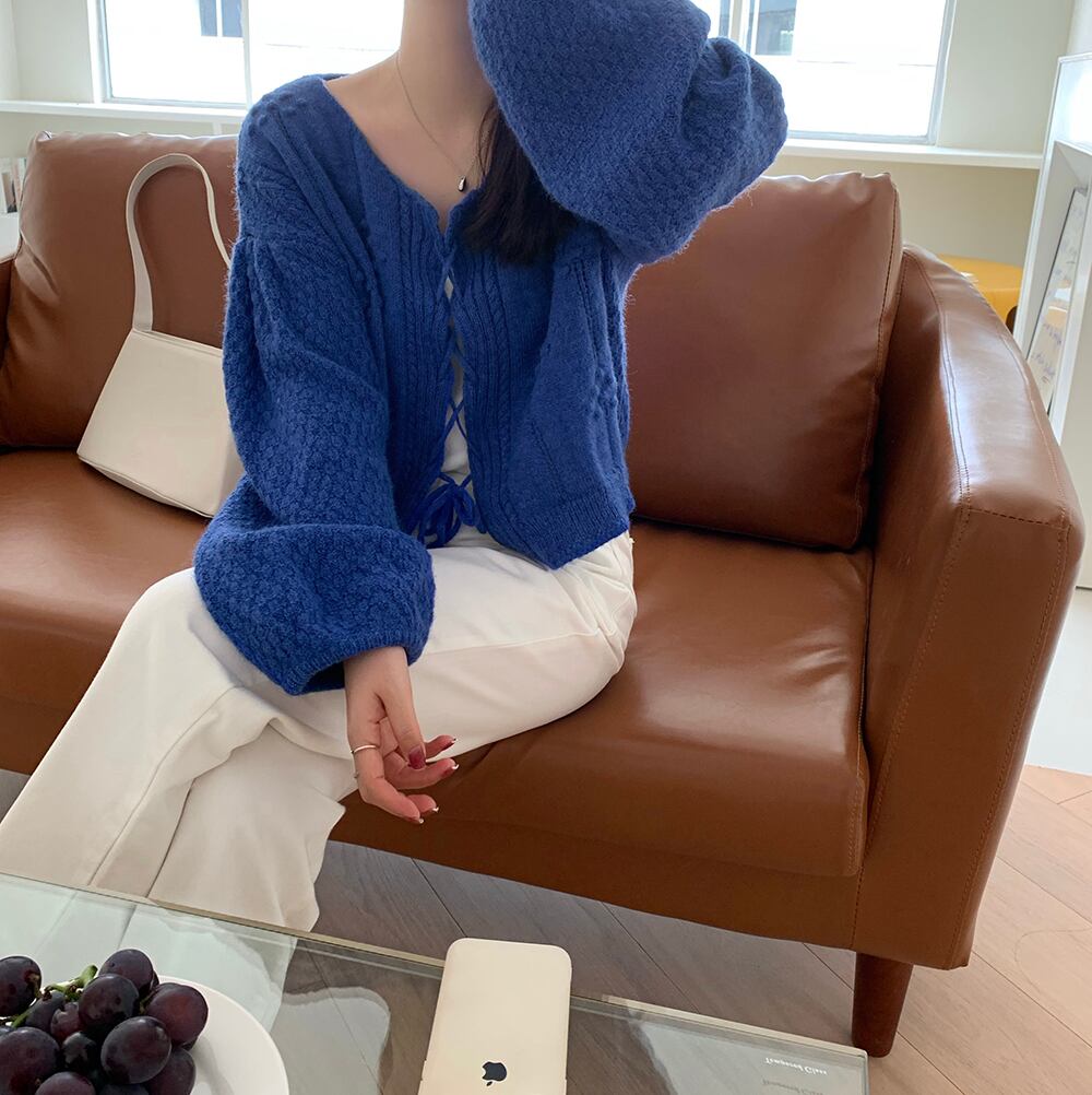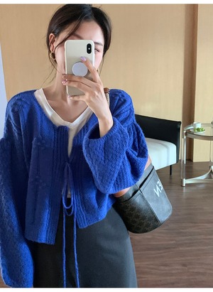 前開きのところをリボン結びで留めるか、編み込み風で留めるかで印象が大きく変わるニットカーディガン。ショート丈でボトムスを選ばず様々なコーデでお使いいただけるアイテムです。