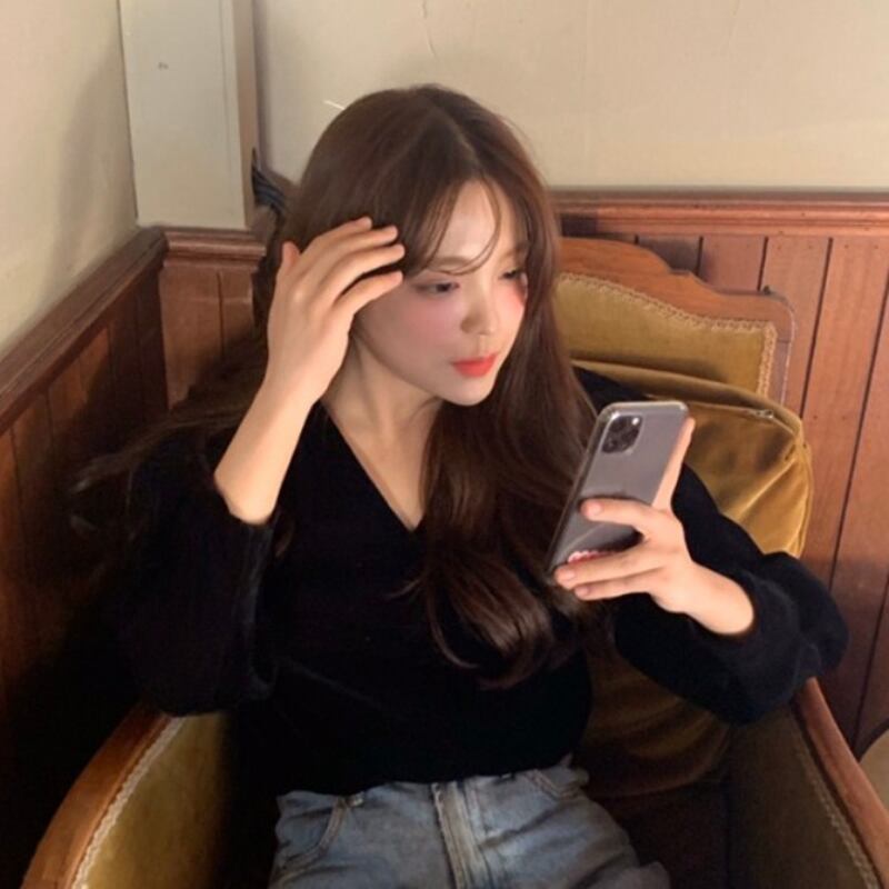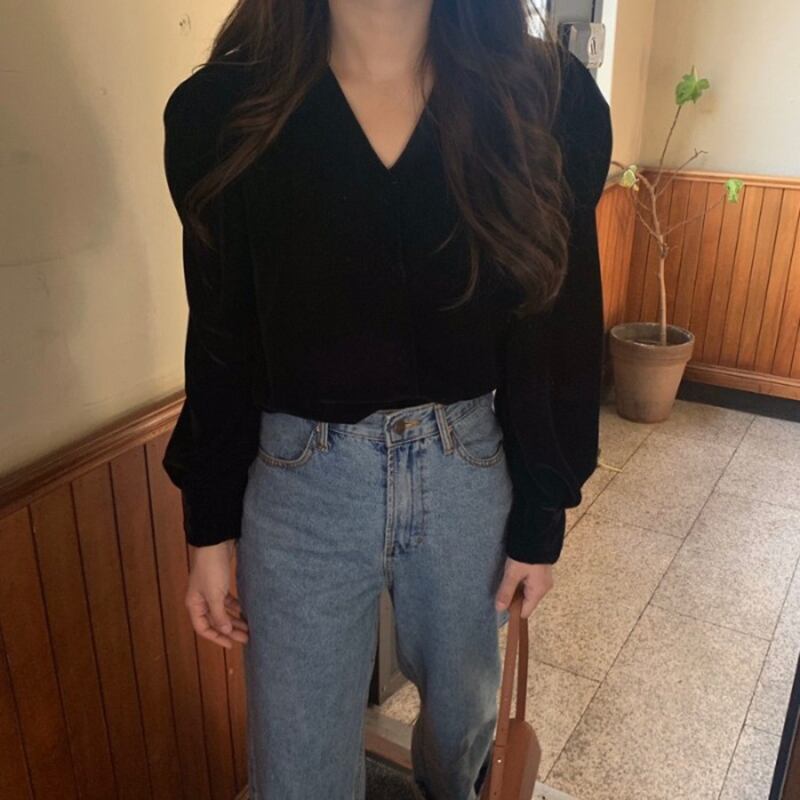 パフスリーブが魅力のシンプルなVネックのベルベットシャツです。