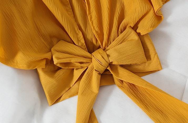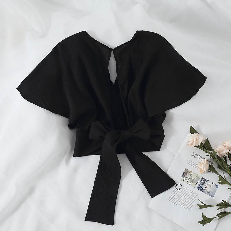 シフォン ブラウス シャツ ショート丈 バックリボン レディース 半袖 個性的 春 夏 秋 かわいい 大人可愛い 大人女子 こなれ感 大人可愛い きれいめ 高校生 大学生 キュート フェミニン セクシー フリーサイズ 四色 ブラック イエロー ホワイト ピンク 黒 黄色 白 桃