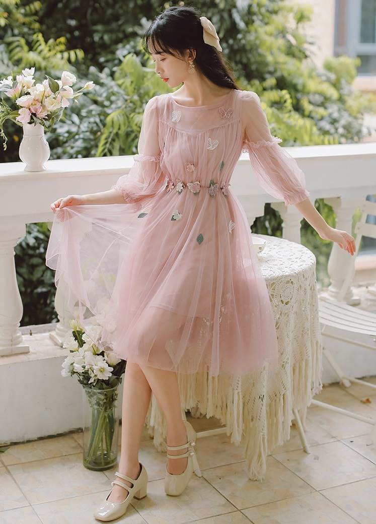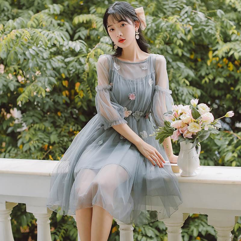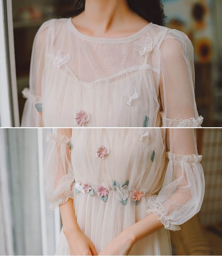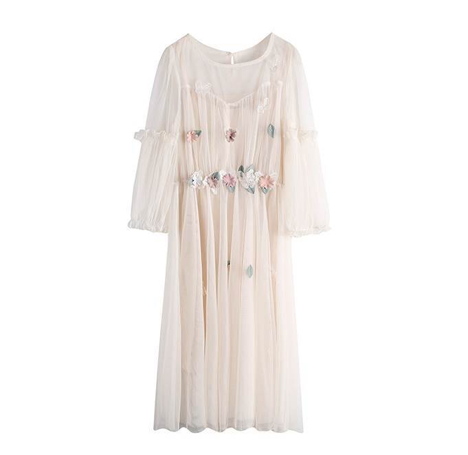 ドレスワンピ キャミソール 2点セット ワンピース ドレス 立体 フラワー 花柄 レース シースルー シアー 透け感 インナーキャミ キャミ付き ツーピース 膝丈 ひざ丈 ふんわり パフ袖 パフスリーブ フリル ラウンドネック ウエストゴム 伸縮性 ハイウエスト 切り替え 重ね着 レイヤード おしゃれ お洒落 かわいい 可愛い 通勤 通学 学生 お出かけ デート 旅行 休日 パーティ イベント お呼ばれ 女子会 普段使い 10代 20代 レディース 夏 S M L アプリコット グレーブルー ピンク
