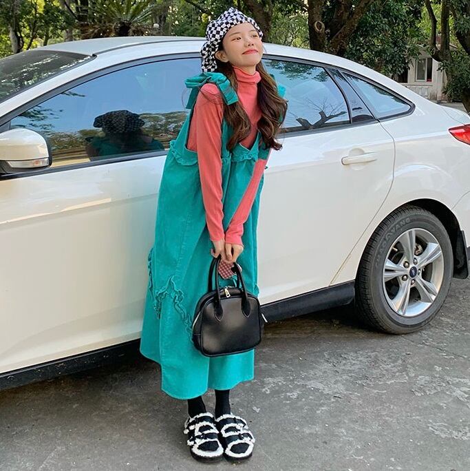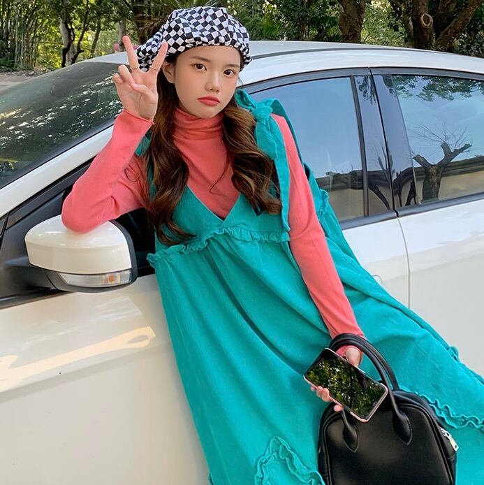 色展開 ピンク(ワンピ)×白(ロンT) 紫(ワンピ)×黒(ロンT) 緑(キャミ)×ピンク(ロンT)