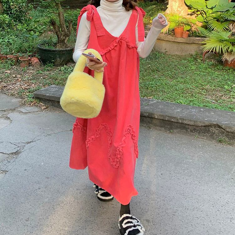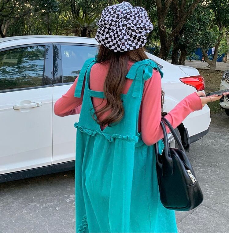 セットアップ キャミソールワンピース ロンT 2点セット トップス ワンピース 長袖 Tシャツ 膝下 ミモレ丈 ロング丈 Vネック Aライン 切り替えデザイン フリル リボン ツーピース かわいい 大人可愛い カジュアル 大人 おしゃれ お洒落 大人女子 ラブリー キュート ガーリー 無地 春 秋 10代 20代 レディース 通勤 学生 通学 デート お出かけ 女子会 休日 旅行 着回し 普段使い 重ね着 韓国 ゆったり フリーサイズ 色展開 白 ホワイト 黒 ブラック 緑 グリーン 紫 パープル ピンク
