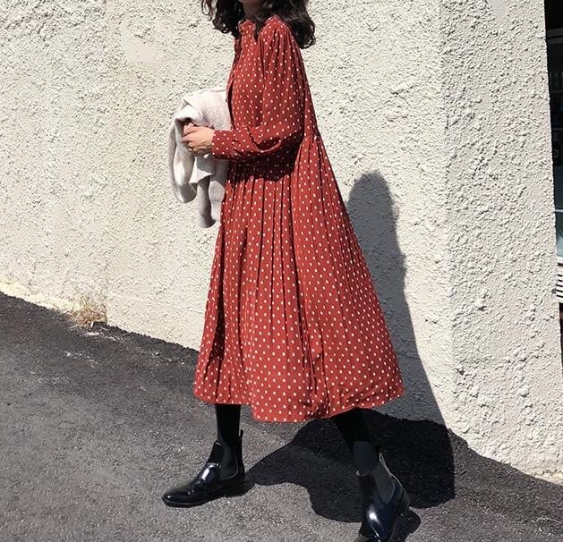 ドット柄ワンピース ワンピース フレアワンピース 膝丈 ひざ丈 ミモレ ミモレ丈 袖あり 長袖 ラウンドネック フレア プリーツ ハイウエスト かわいい 大人可愛い きれいめ シンプル カジュアル 大人 上品 おしゃれ お洒落 レトロ 大人可愛い 大人女子 こなれ感 キュート ガーリー モダン 主役級 存在感 柄 ドット柄 水玉 春 秋 10代 20代 30代 レディース 学生 通学 デート お出かけ 女子会 休日 着回し 普段使い 重ね着 サイズ L XL 2XL 3XL 4XL 色展開 黒 ブラック