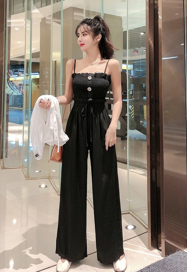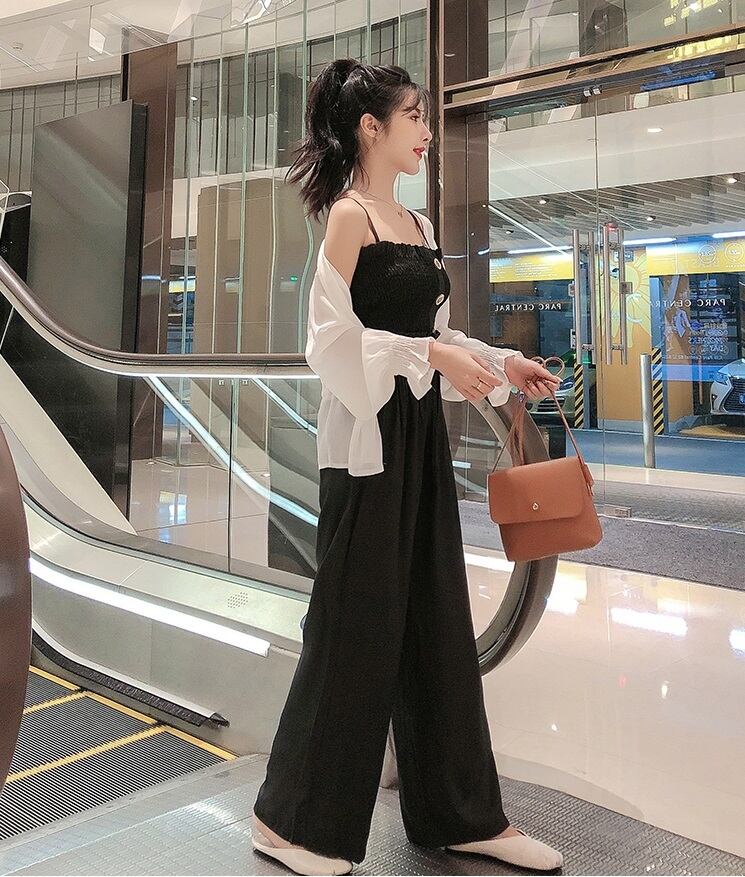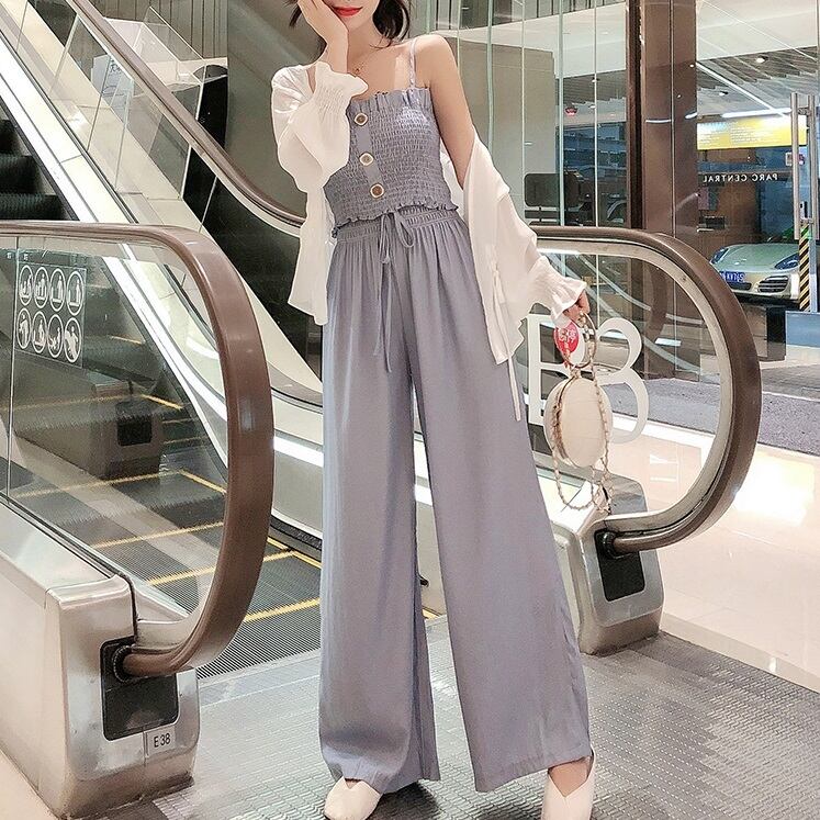 ショート丈カーディガンとキャミソール、ワイドパンツの3点セットです。