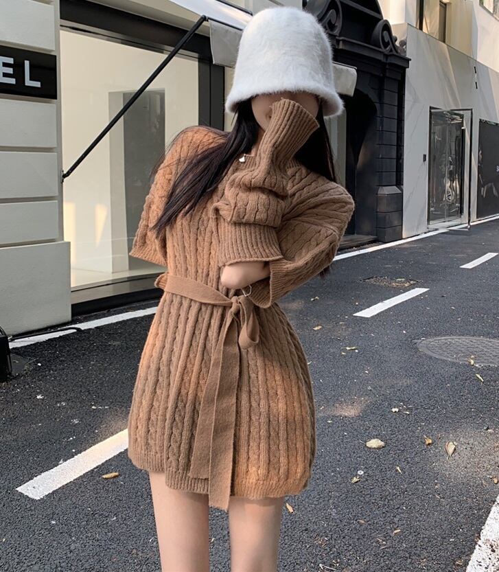 長袖 ベルト付き ケーブル編み ニットワンピース 3点セット トップス ワンピース セーター ミニ丈 袖あり 半袖 ラウンドネック ウエストリボン ハイウエスト ケーブルニット 編み込み ニット スリーピース かわいい 大人可愛い カジュアル 大人 おしゃれ お洒落 大人女子 こなれ感 個性的 柄 春 秋 冬 10代 20代 レディース 通勤 学生 通学 デート お出かけ 女子会 休日 旅行 着回し 普段使い 重ね着 韓国 暖かい ゆったり フリーサイズ 色展開 黒 ブラック 茶色 ブラウン アプリコット