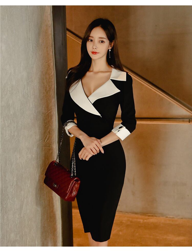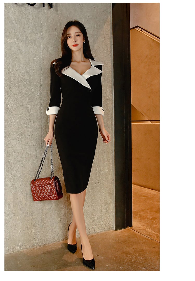 ワンピース 膝丈 ひざ丈 袖あり 7分袖 七分袖 Vネック 襟付き スリム タイト 細身 ハイウエスト かわいい 大人可愛い きれいめ シンプル カジュアル 大人 上品 おしゃれ お洒落 大人可愛い 大人女子 こなれ感 個性的 クール モード系 セクシー エレガント モダン 主役級 存在感 無地 春 秋 20代 30代 レディース 女性用 デート お出かけ 女子会 お泊まり 休日 パーティー イベント 旅行 コーデ スタイル モテ 美脚 脚長 サイズ S M L XL 色展開 黒 ブラック