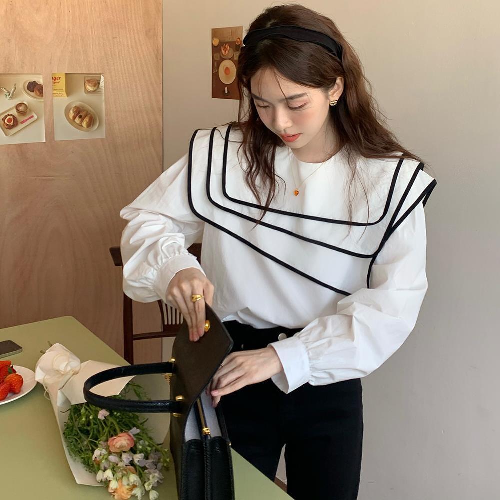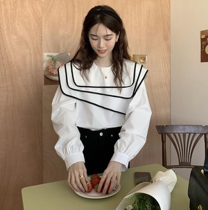 大きめ襟 パフスリーブ シャツ ブラウス トップス プルオーバー ミディアム丈 袖あり 長袖 ラウンドネック 襟付き かわいい 大人可愛い きれいめ シンプル カジュアル 大人 おしゃれ お洒落 大人女子 こなれ感 キュート ガーリー ルーズ 個性的 主役級 ボーダー シマ 春 秋 10代 20代 レディース 通勤 学生 通学 デート お出かけ 女子会 休日 旅行 着回し 普段使い 重ね着 韓国 韓国系 オルチャン ゆったり サイズ S M L XL 色展開 白 ホワイト