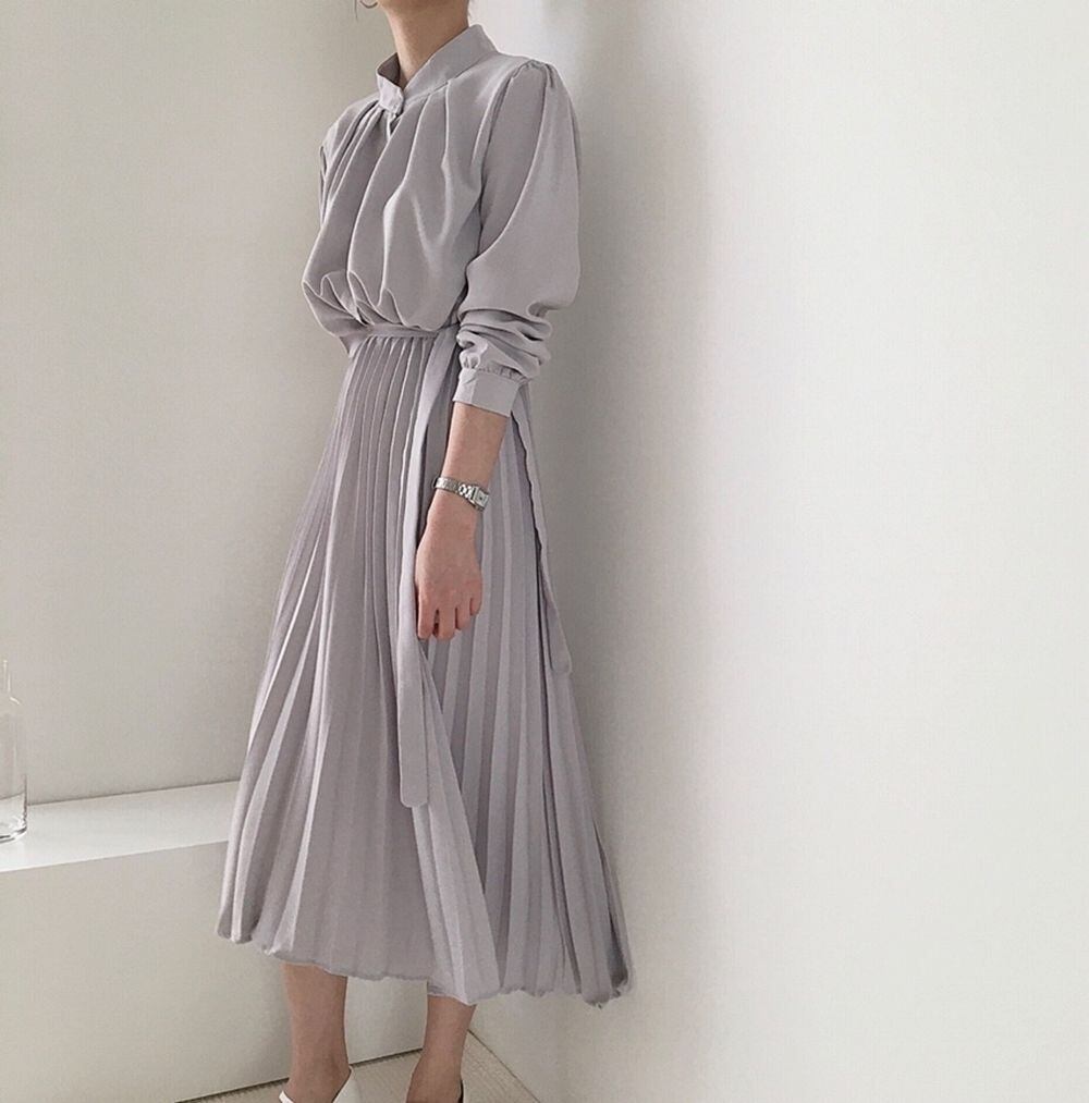 エレガントなシングルブレスト長袖プリーツワンピースです。