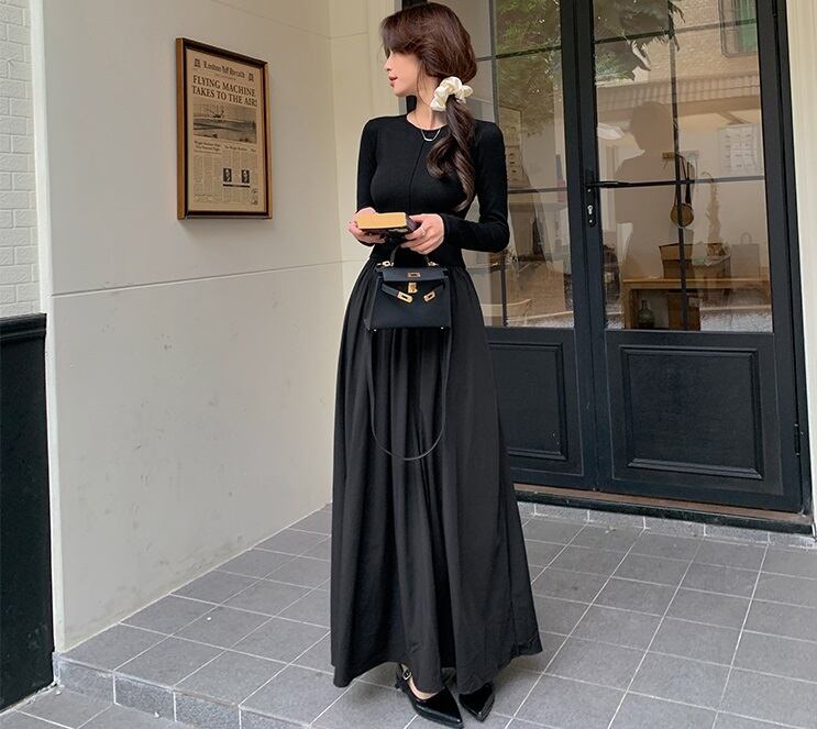 異素材MIX 長袖 ロング ワンピース フレアワンピース ワンピドレス 膝下 ロング丈 マキシ マキシ丈 袖あり ラウンドネック 襟なし スリム 細身 Aライン 切り替えデザイン ハイウエスト かわいい 大人可愛い シンプル 大人 おしゃれ お洒落 大人女子 無地 春 秋 10代 20代 レディース 通勤 学生 通学 デート お出かけ 女子会 休日 旅行 着回し 普段使い 韓国 韓国系 サイズ S M 色展開 黒 ブラック