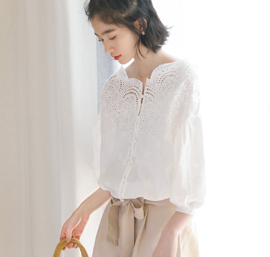 トップス シャツ ブラウス 白シャツ 白トップス 袖あり 5分袖 五分袖 ボリューム袖 Vネック 襟なし ストレート 前開き 透け感 薄手 かわいい 大人可愛い きれいめ シンプル カジュアル 大人 上品 おしゃれ お洒落 大人可愛い 大人女子 こなれ感 ラフ ガーリー ルーズ 個性的 主役級 存在感 とろみ感 抜け感 柄 花柄 小花柄 フラワー 夏 誕生日 10代 20代 30代 40代 50代 60代 レディース 女性用 ママ マタニティ オフィス ビジネス OL 通勤 学生 通学
