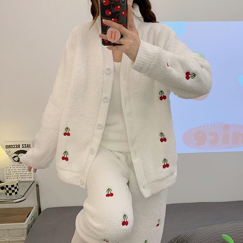 ルームウェア パジャマ 3点セット 上下セット トップス ボトムス パンツ インナー タンクトップ ロング ロング丈 袖あり ノースリーブ 長袖 Vネック 襟なし ストレート ワイド ふわふわ ハイウエスト 厚手 フランネル スリーピース かわいい 大人可愛い カジュアル 大人 おしゃれ お洒落 大人女子 ラフ キュート ガーリー 柄 さくらんぼ柄 春 秋 冬 10代 20代 レディース 学生 デート お泊まり 休日 旅行 重ね着 韓国 暖かい 大きいサイズ M L XL 2XL 色展開 白 ホワイト