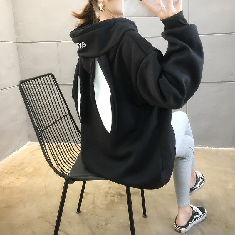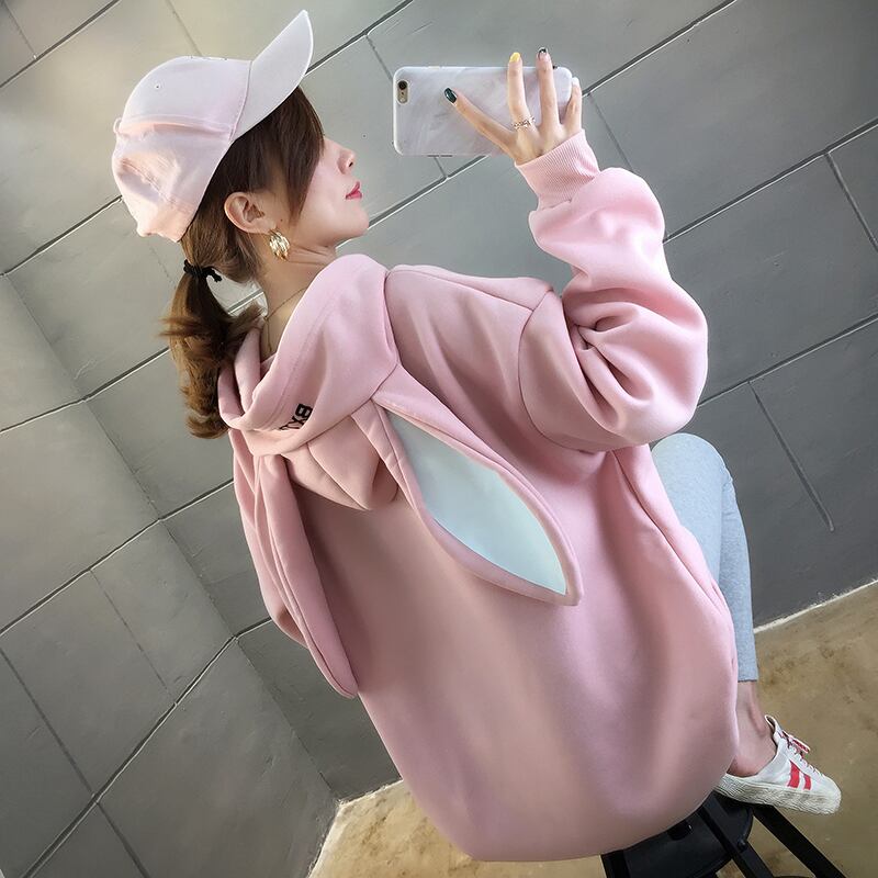トップス パーカー うさ耳 ミドル丈 ストレート フード付き ポケット 裏起毛 かわいい カジュアル おしゃれ お洒落 メンズライク ガーリー ラフ ルーズ ラブリー キュート 個性的 無地 春 秋 冬 10代 20代 レディース デート お出かけ ファッション サイズ M L XL 2XL ビッグサイズ ゆったり ゆる 色展開 ホワイト ブラック ピンク