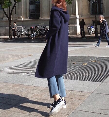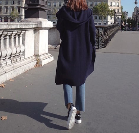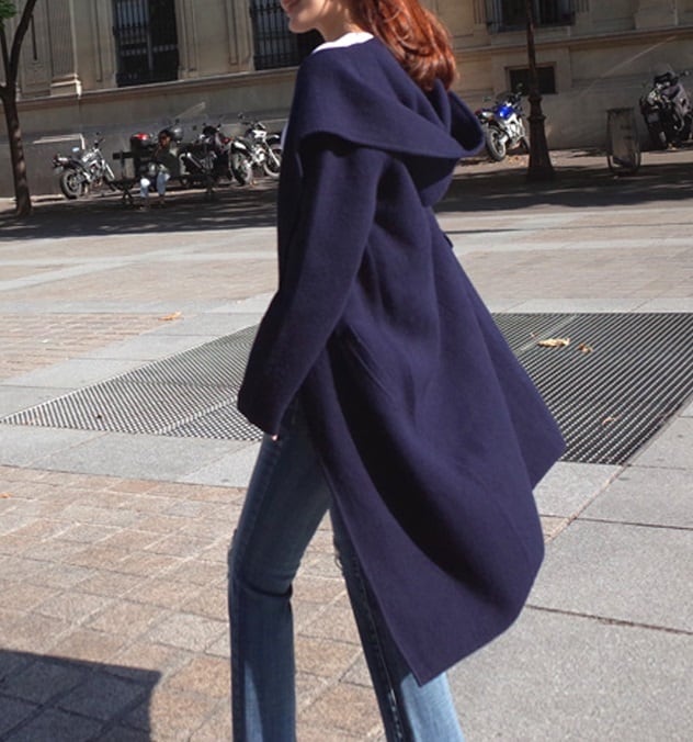 あったかいミディアム丈のフード付きコート。