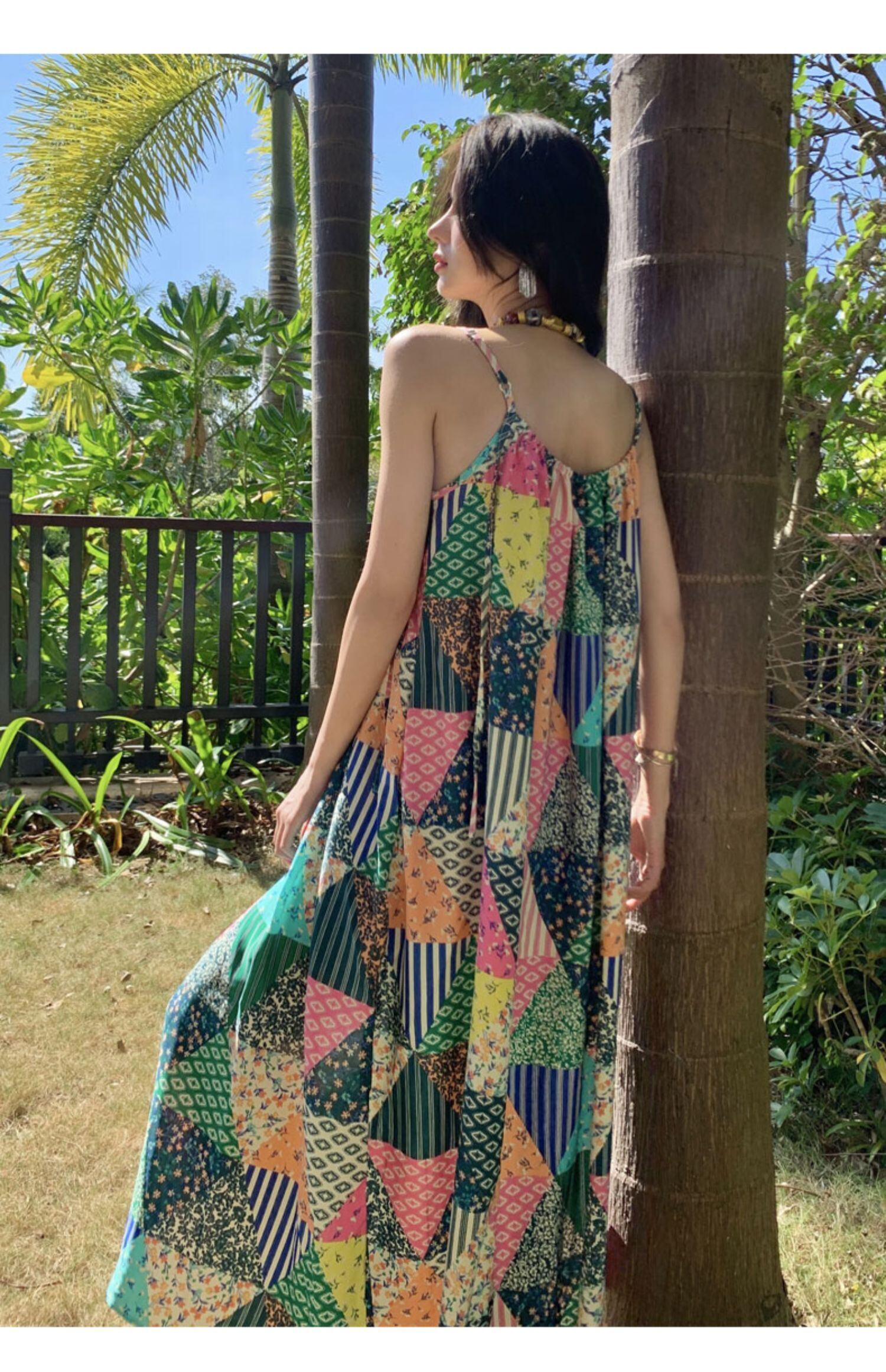 幾何学柄ワンピース ワンピース フレアワンピース フレア ワイド Iライン 綿 ポリエステル かわいい 大人可愛い シンプル カジュアル おしゃれ お洒落 アジアン エスニック 大人可愛い 大人女子 クール モード系 ボタニカル 夏 10代 20代 リゾート 旅行 海 プール M