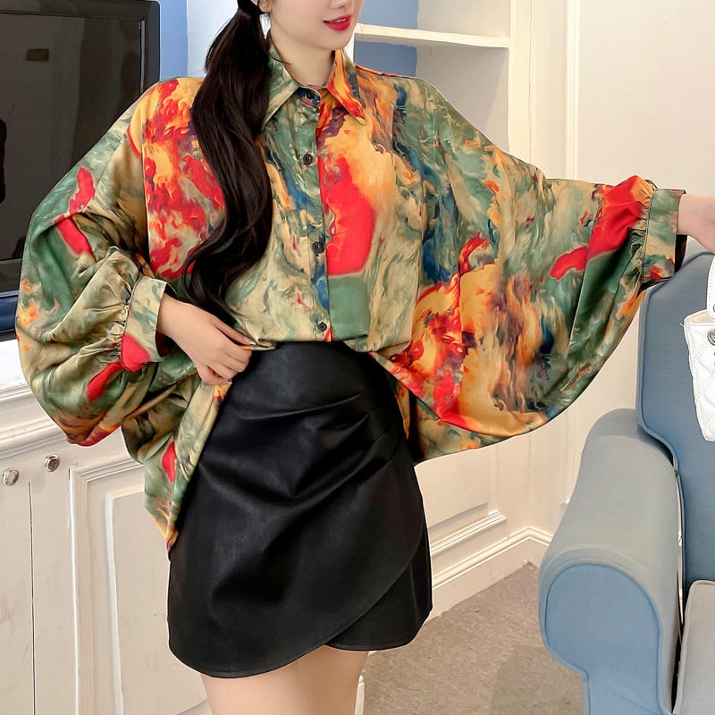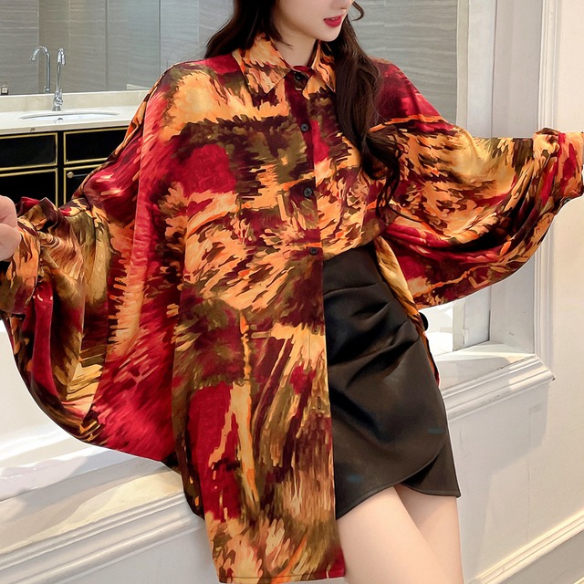 トップス シャツ 袖あり 長袖 ボリューム袖 襟付き フレア ワイド 前開き 大人可愛い きれいめ カジュアル 大人 上品 おしゃれ お洒落 アジアン エスニック エキゾチック 大人女子 こなれ感 ラフ 個性的 主役級 存在感 柄 秋 20代 30代 レディース 女性用 デート お出かけ 女子会 リゾート 旅行 普段使い ファッション コーデ スタイル 楽ちん モテ 体系カバー サイズ フリーサイズ ワンサイズ 色展開 レッド&グリーン系 イエロー系 レッド系