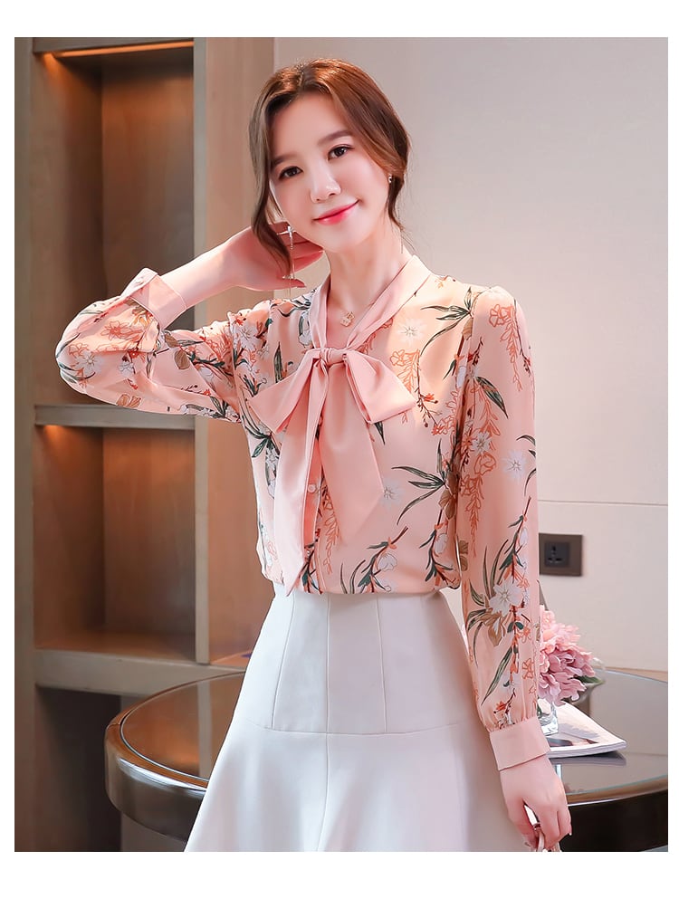 トップス シャツ ブラウス 袖あり 長袖 リボンタイ ストレート シフォン かわいい 大人可愛い きれいめ 上品 おしゃれ お洒落 大人女子 花柄 フラワー 春 秋 20代 30代 レディース ビジネス OL 通勤 デート お出かけ お呼ばれ ファッション サイズ S M L XL 2XL 3XL 色展開 ピンク ライトブルー