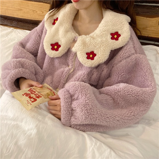 ふわふわもこもこがガーリー。大きな襟についたお花もアクセント。お家時間が楽しく過ごせる可愛いアイテムです。