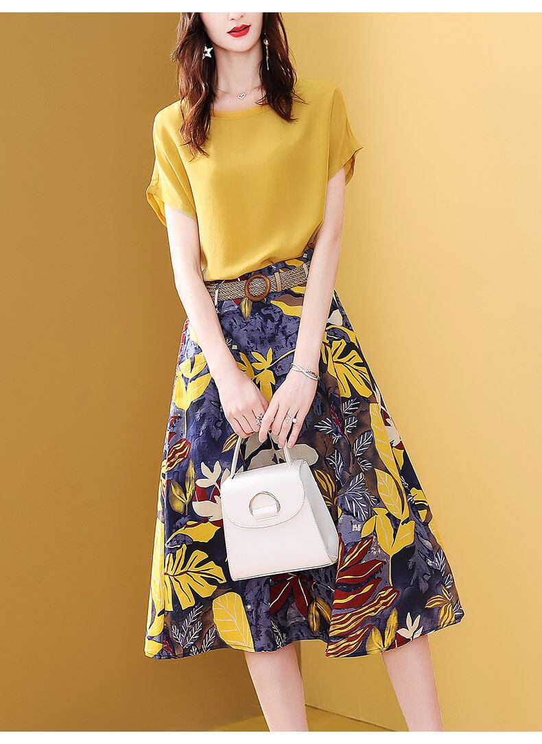 ツーピース トップス スカート Tシャツ 膝下 ミモレ ミモレ丈 袖あり 半袖 フレンチスリーブ Uネック ラウンドネック フレア Aライン ベルト シルク 絹 上下セット 2点セット お得 かわいい 大人可愛い きれいめ シンプル 大人 上品 おしゃれ お洒落 かっこいい レトロ 大人女子 こなれ感 ラフ ラブリー キュート 個性的 クール シック 華やか フェミニン 無地 リーフ柄 ボタニカル プリント レディース 女性用 着回し 普段使い 重ね着 S M L XL 青 ブルー 黄色 イエロー