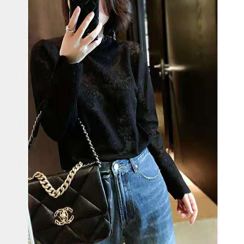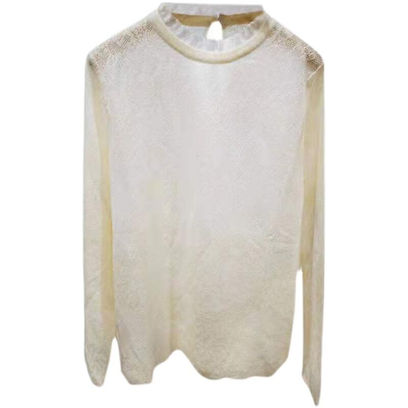 レースが魅力のシアーハイネックトップス。