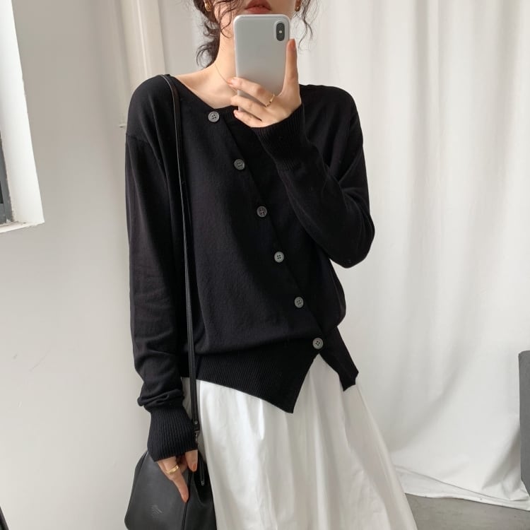 胸元にかけて斜めデザインのボタンが特徴的です。