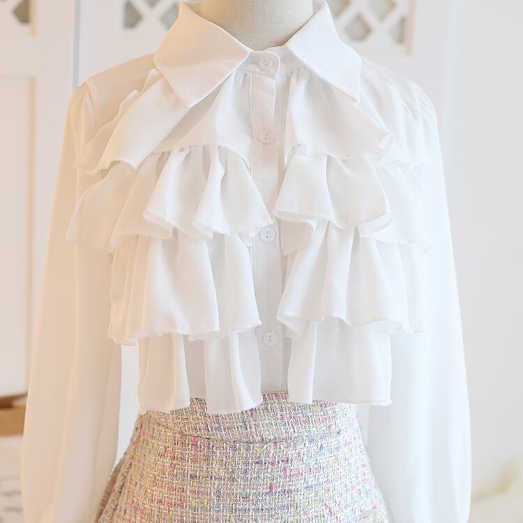 ツイード生地のジャケット、プリーツミニスカート、フリル付きブラウスの3点セット。縁のパールやアシンメトリーのスカートのデザインがおしゃれ。きれいめコーデにおすすめなアイテムです。