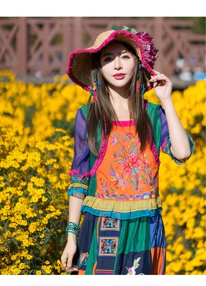 まるで民族衣装のような色合い豊かなおしゃれなトップス。胸元の刺繍やフリルがアクセント。コーデの主役になるおしゃれなアイテムです。