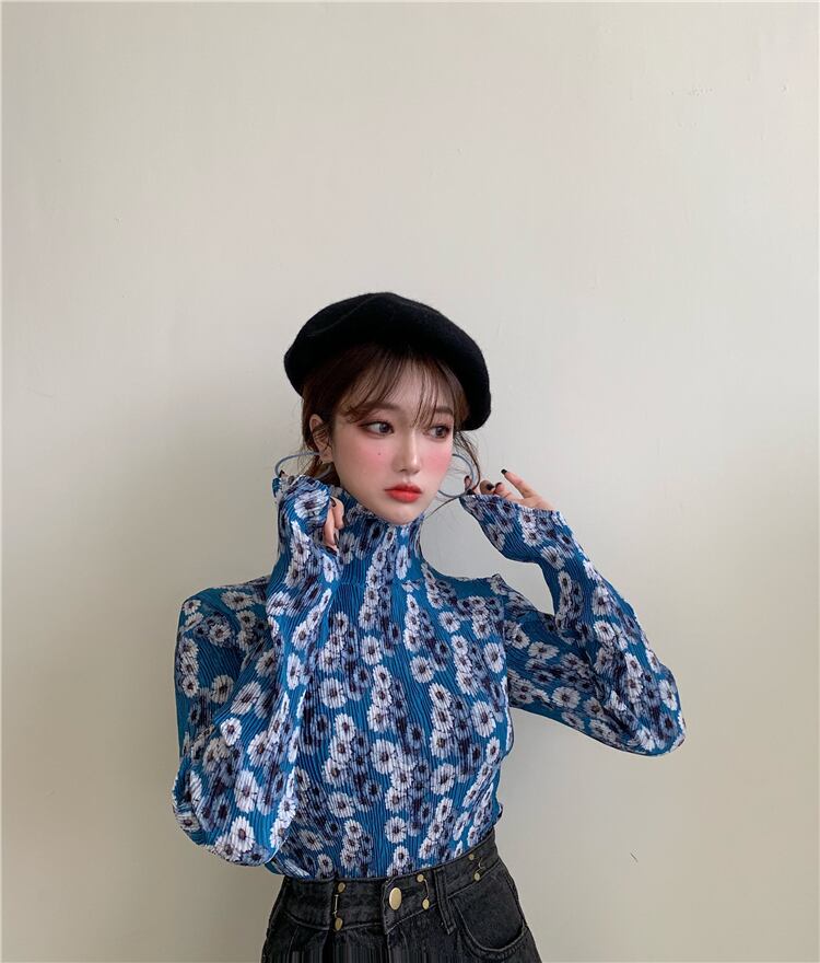 トップス Tシャツ 袖あり 長袖 ハイネック タートルネック 細プリーツ かわいい 大人可愛い きれいめ カジュアル おしゃれ お洒落 花柄 春 秋 10代 20代 30代 レディース デート お出かけ ファッション モテ フリーサイズ ブルー