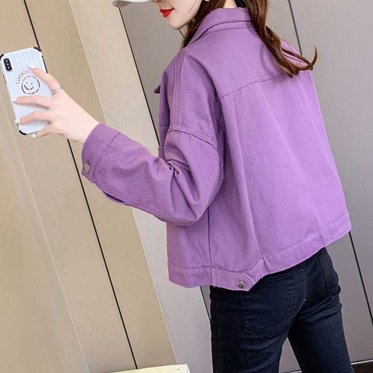 ジャケット デニム レディース デニムジャケット キャンディーカラー オールマッチ スモールジャケット ショート 長袖 ポロ襟 ポケット シングルブレスト ルーズタイプ 短い かわいい 大人可愛い きれいめ シンプル カジュアル 大 人 上品 おしゃれ お洒落 かっこいい レトロ 着回し 普段使い 重ね着 お揃い 双子 韓国 韓国系 オルチャン ファッション コーデ スタイル プレゼント ギフト 定番 安い 楽ちん 旅行 海 インスタ映え 無地 パープル クラレット 春 秋 冬 S M L XL 2XL