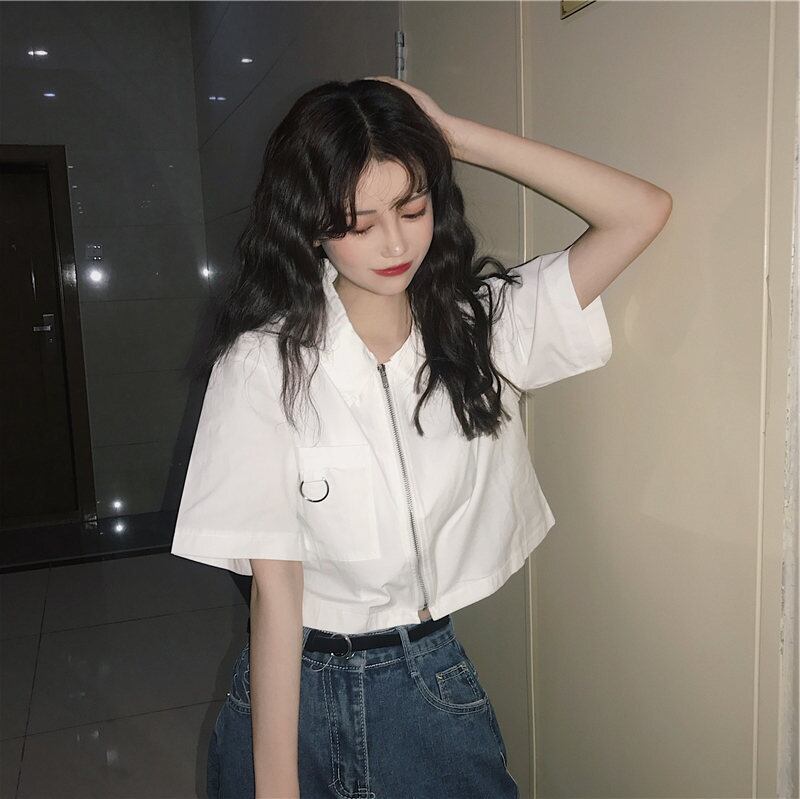 ショート丈の可愛いジッパー付き半袖シャツです。