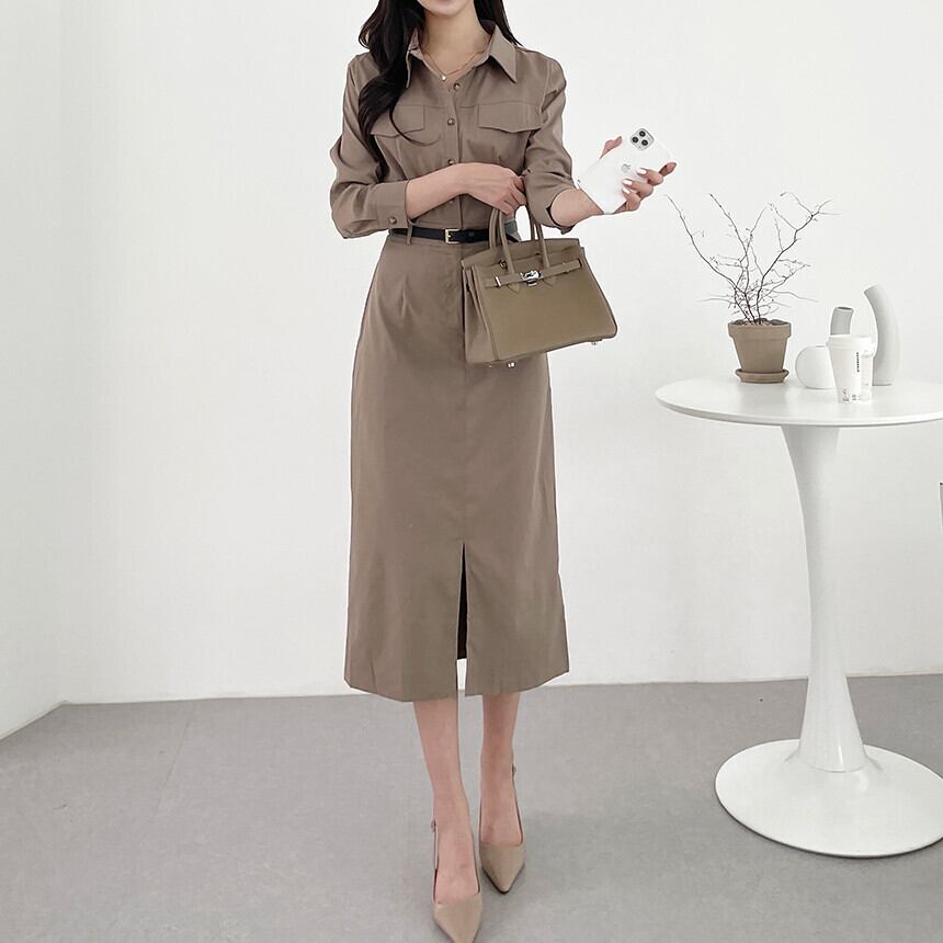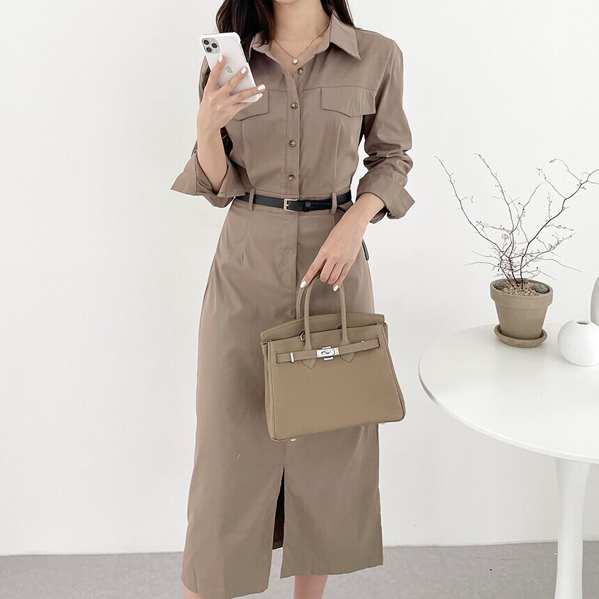 ワンピース シャツワンピース 袖あり 長袖 襟付き セミフレア 前開き 綿 リネン かわいい 大人可愛い シンプル 大人 上品 おしゃれ お洒落 無地 春 秋 入学式 入園式 10代 20代 30代 レディース ママ 韓国 韓国系 オルチャン ファッション 暖かい M 黒 ブラック ベージュ カーキ