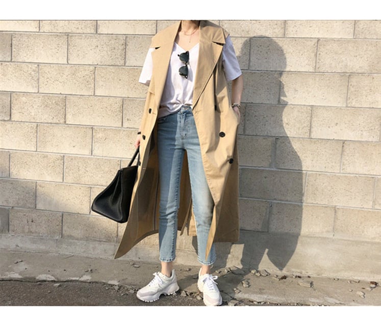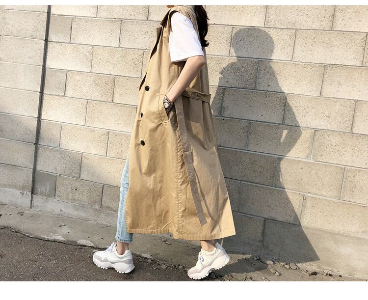 レイヤードコーデに使えるロング丈のノースリーブコート。前をしめてトップス風や、前を開けてコート風にも楽しめる。これからの季節のカジュアルコーデにおすすめなアイテムです。