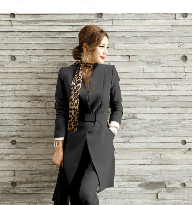お尻まですっぽり隠れる丈のジャケットとパンツのスーツ2点セット。ノーカラージャケットで首元すっきりで大人っぽ。ジャケットをベルトでしめると違った印象に。それぞれで着回し力もあるおしゃれなアイテムです。