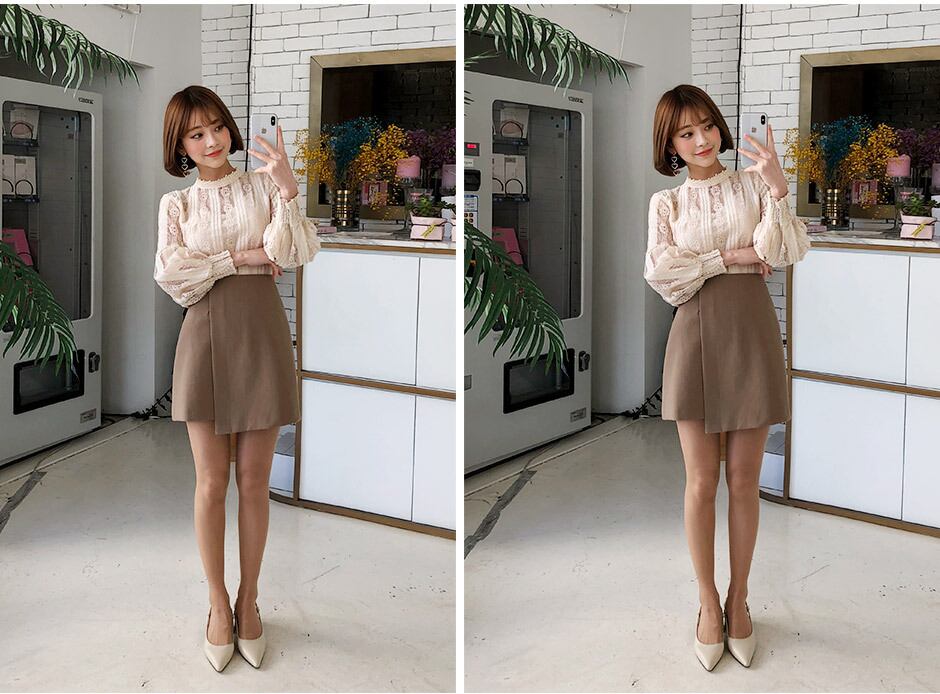 透け感のあるレース生地がおしゃれ。スタンドカラーで上品感。ほんのりくすみカラーなのが派手すぎず大人っぽ。きれいめカジュアルにおすすめなアイテムです。