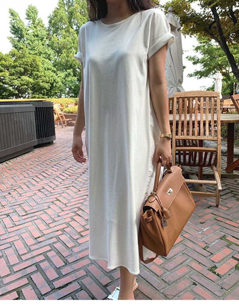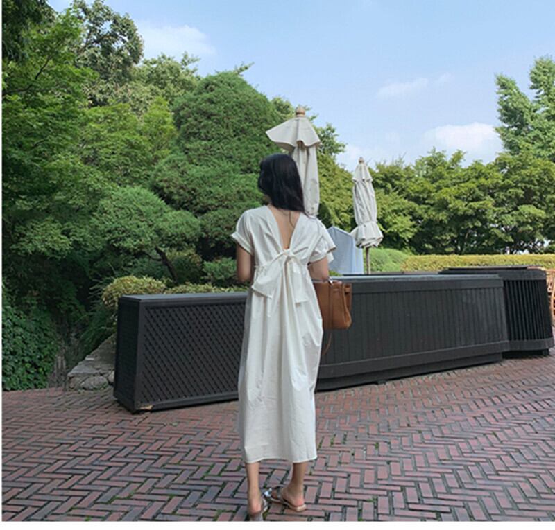 ワンピース ロングスカート ロング丈 袖あり 半袖 Uネック Aライン バックリボン バックレス かわいい 大人可愛い シンプル カジュアル おしゃれ お洒落 ガーリー 無地 夏 10代 20代 レディース デート お出かけ ファッション スタイル 楽ちん サイズ S M L XL ホワイト