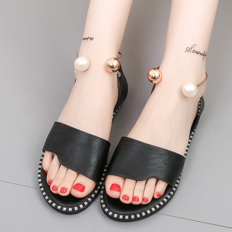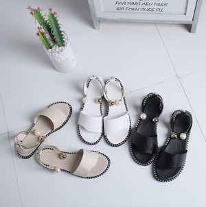 パールバックルがポイントのフラットサンダル。