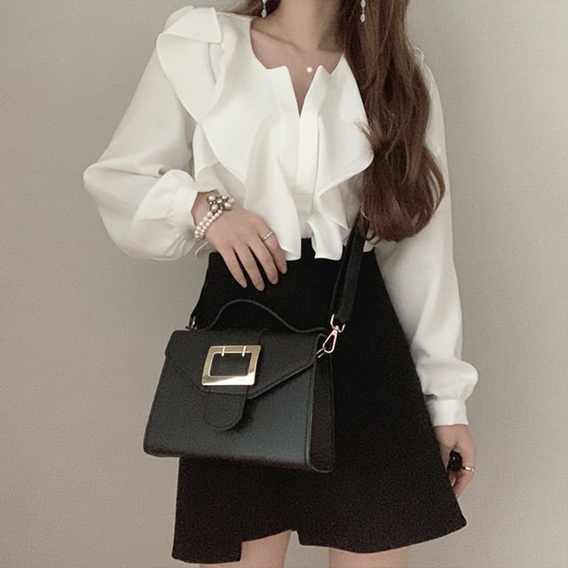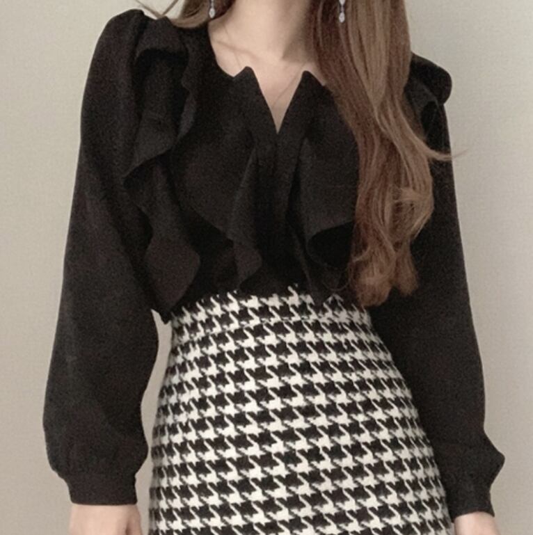 襟なしのデザインにフリルが可愛らしさをプラス。シンプルながらもこなれ感のある一枚は、ビジネスシーンからデートや女子会まで幅広く活躍。