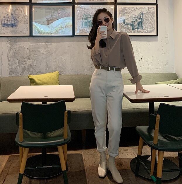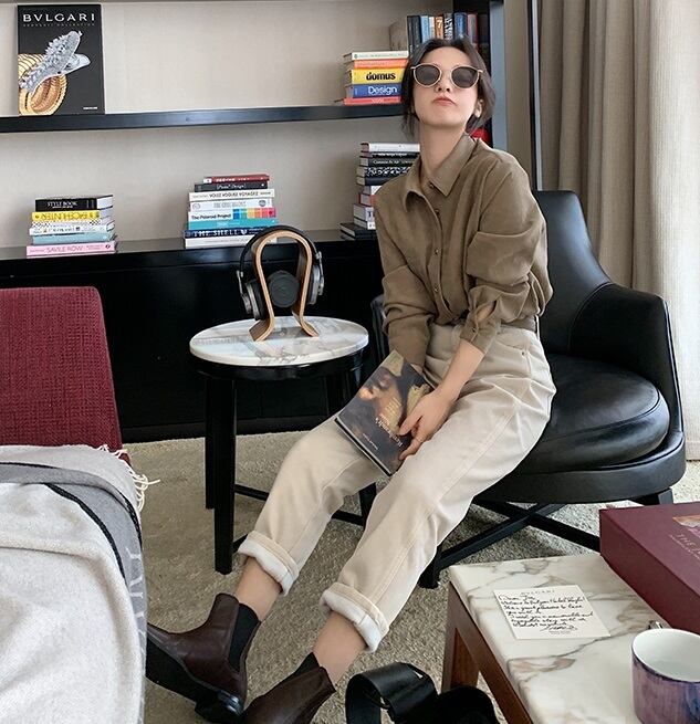 くすみカラーの襟付き長袖シャツで大人可愛いスタイルを叶えよう!