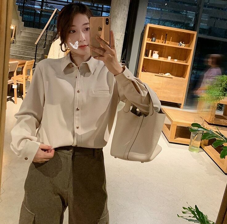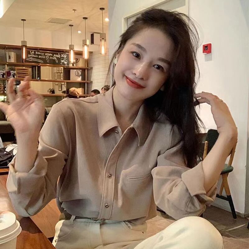 くすみカラー 襟付き 長袖 シャツ ブラウス トップス ミディアム丈 袖あり ポケット 前開き 厚手 かわいい 大人可愛い きれいめ シンプル カジュアル 大人 おしゃれ お洒落 大人女子 こなれ感 無地 春 秋 10代 20代 30代 レディース 通勤 学生 通学 デート お出かけ 女子会 休日 旅行 着回し 普段使い 重ね着 韓国 韓国系 大人カラー 大きいサイズ M L XL 2XL 色展開 茶色 ライトブラウン ミルクティーブラウン 灰色 グレーブルー アプリコット