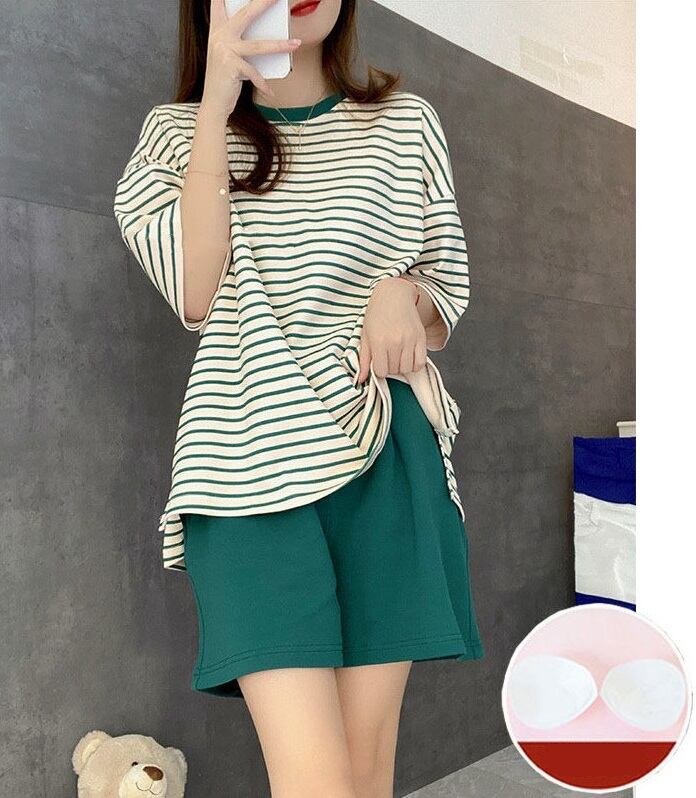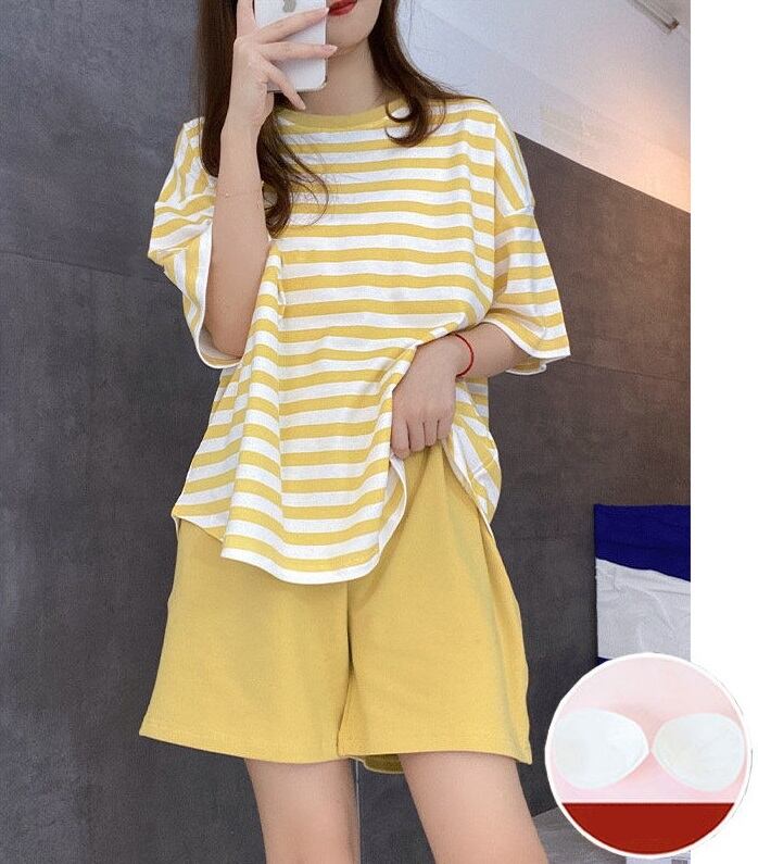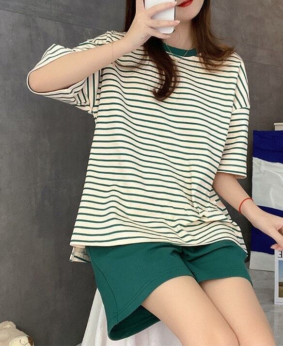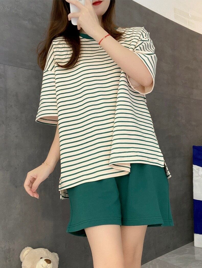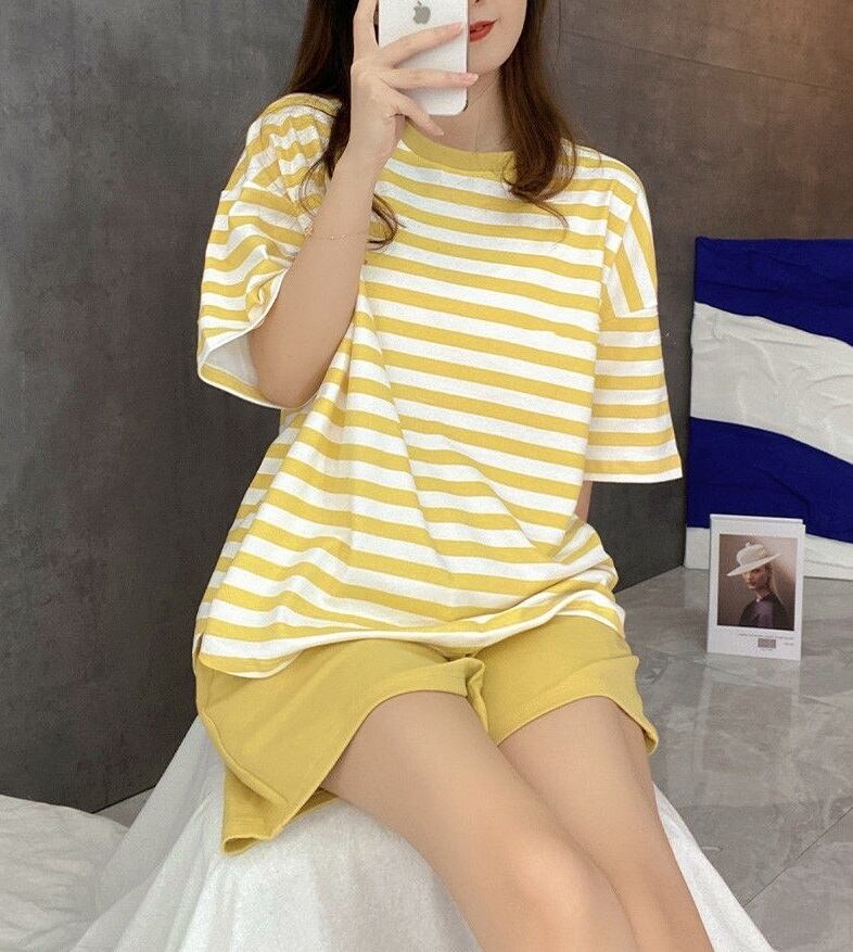 ルームウェア ボーダー柄 パジャマ Tシャツ ショートパンツ 2点セット 上下セット トップス ボトムス パンツ セットアップ ショート丈 袖あり 半袖 ラウンドネック ツーピース かわいい 大人可愛い シンプル カジュアル 大人 おしゃれ お洒落 大人女子 ラフ ルーズ 柄 ボーダー シマ 春 夏 10代 20代 レディース 学生 デート お泊まり 休日 旅行 着回し 重ね着 韓国 楽ちん ゆったり 大きいサイズ M L XL 2XL 色展開 黒 ブラック 緑 グリーン 灰色 グレー 黄色 イエロー