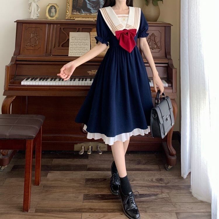 魅力的なセーラーカラーにリボンが可愛いらしい半袖フレアワンピース!