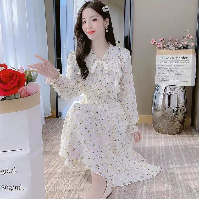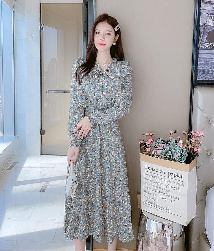 花柄 リボン 長袖 ミモレ丈 ワンピース フレアワンピース 膝下 ミモレ 袖あり ラウンドネック 襟なし スリム Aライン ハイウエスト ウエストゴム 伸縮性 かわいい 大人可愛い きれいめ カジュアル 大人 上品 おしゃれ お洒落 大人女子 ガーリー 主役級 柄 小花柄 フラワー 春 秋 10代 20代 レディース 通勤 学生 通学 デート お出かけ 女子会 休日 旅行 着回し 普段使い 重ね着 韓国 楽ちん サイズ S M L XL 色展開 白 ホワイト 青 ブルー 緑 グリーン