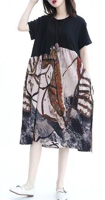 異素材MIX ドッキング 切り替え 半袖 Tシャツワンピース ワンピース 膝丈 ひざ丈 袖あり ラウンドネック 襟なし ハイウエスト かわいい 大人可愛い カジュアル 大人 おしゃれ お洒落 大人女子 こなれ感 ルーズ 個性的 主役級 存在感 柄 リーフ柄 ボタニカル 春 夏 30代 40代 レディース ママ マタニティ 通勤 デート お出かけ 女子会 休日 旅行 着回し 普段使い 重ね着 韓国 楽ちん 体系カバー ゆったり ゆる 大きいサイズ M L XL 2XL 3XL 4XL 色展開 黒 ブラック