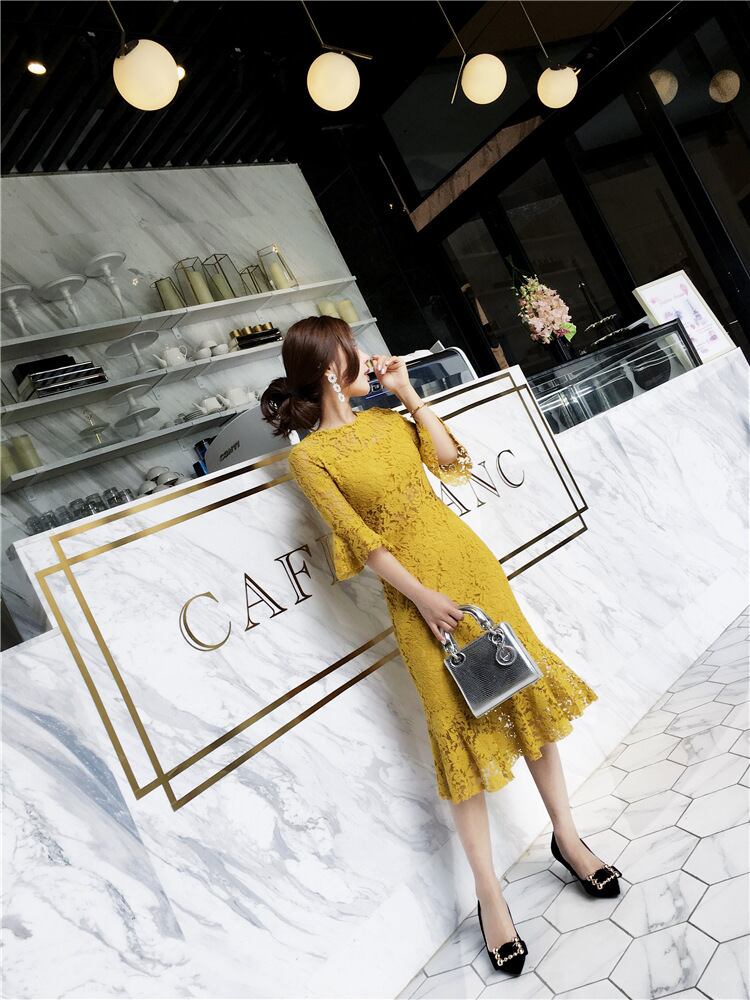 ドレス パーティードレス 結婚式ドレス 膝丈 ひざ丈 袖あり 5分袖 五分袖 ハイネック プリンセス プリンセスライン レース 刺繍 シフォン かわいい 大人可愛い 大人 上品 おしゃれ エキゾチック 大人可愛い 大人女子 セクシー エレガント 存在感 10代 20代 レディース 韓国系 オルチャン ファッション S M L イエロー