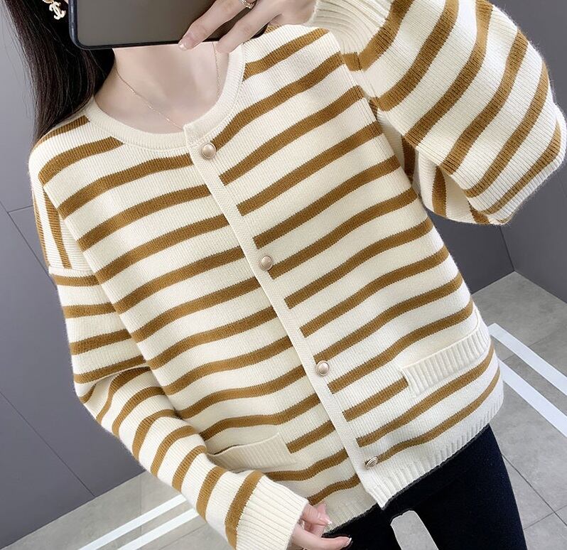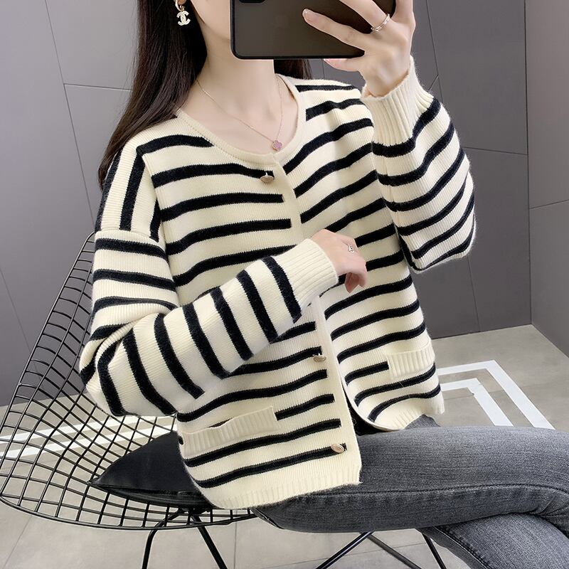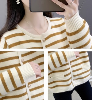 ボーダー柄にパールボタンが可愛い!ラウンドネックのニットカーディガン。